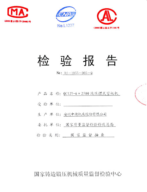 根據(jù)2006年第4季度剪板機(jī)國家監(jiān)督抽查實(shí)施方案,受國家質(zhì)量監(jiān)督檢驗(yàn)檢疫總局委托,國家鑄造鍛壓機(jī)械質(zhì)量監(jiān)督檢驗(yàn)中心,于2006年9月23日,對本公司產(chǎn)中德牌液壓擺式剪板機(jī)進(jìn)行了現(xiàn)場檢驗(yàn)。近日,我公司收到了本次抽檢的結(jié)果通知單及檢驗(yàn)報告,結(jié)果為:合格。