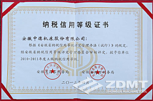 中德機床喜獲安徽省“A級納稅信用等級單位”稱號